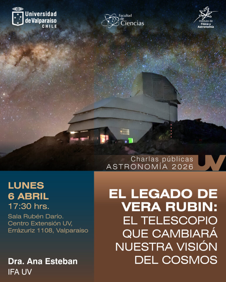 El IFA de la Universidad de Valparaíso inicia su ciclo 2026 de Charlas Públicas de Astronomía, celebrando 20 años de divulgación científica, con la conferencia inaugural de la Dra. Ana Esteban sobre el impacto del telescopio Vera Rubin, el lunes 6 de abril en el Centro de Extensión UV.