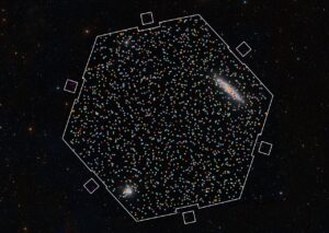 El 18 de octubre, el instrumento 4MOST utilizó por primera vez sus 2.400 fibras para analizar la luz de diferentes objetos cósmicos. El espectrógrafo, que está instalado en el telescopio VISTA de ESO, observó una gran extensión de cielo que contenía dos objetos prominentes: la Galaxia del Escultor y el cúmulo globular NGC288. Esta imagen muestra el campo de visión hexagonal de 4MOST y los muchos objetos (marcados con puntos de diferentes colores para diferentes tipos de objetos) que analizó en sus primeras observaciones de prueba. 4MOST capturó un espectro para cada uno de estos objetos individuales, lo que nos permitió estudiar sus propiedades como la composición química o la temperatura.